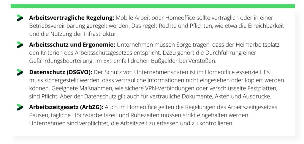 - Arbeitsrechtliche Fragen zum Arbeitsort sind geklärt (Unfallversicherung, Haftung).