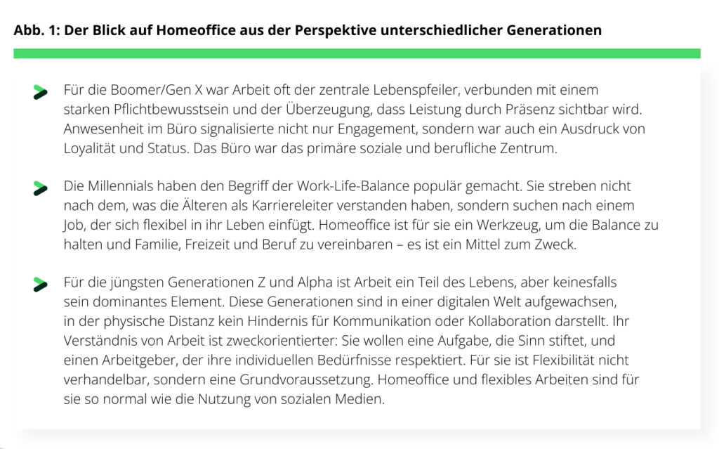 Die Generationenfrage verschärft die Debatte zusätzlich. Was für eine Generation nämlich selbstverständlich war, ist für die nächste verhandelbar oder gar austauschbar. Diese unterschiedlichen Wertewelten führen unweigerlich zu Reibungen und Missverständnissen. Ältere Generationen neigen dazu, die Forderung nach Homeoffice als mangelndes Engagement oder gar Bequemlichkeit zu interpretieren, da sie Präsenz als Gradmesser für Verlässlichkeit sehen. Jüngere Generationen hingegen verstehen das als Misstrauen und eine Ignoranz ihrer individuellen Bedürfnisse. Unternehmen müssen sich dieser Dynamik bewusst sein. Eine Einheitslösung wird keine der Generationen zufriedenstellen. Statt zu versuchen, alle in ein starres Präsenz- oder Remote-Modell zu zwängen, müssen Unternehmen eine Arbeitskultur schaffen, die unterschiedliche Bedürfnisse respektiert und gleichzeitig den Zusammenhalt stärkt. Nur so lassen sich die besten Talente aller Generationen gewinnen und langfristig binden. Es empfiehlt sich daher stets, den generationenübergreifenden Austausch proaktiv zu fördern, um ein gegenseitiges Verständnis für die unterschiedlichen Perspektiven auf Homeoffice zu schaffen. Und gleichzeitig transparent zu machen, wie mit teilweise notwendigen Rückkehrphasen ins Unternehmen umgegangen werden soll.