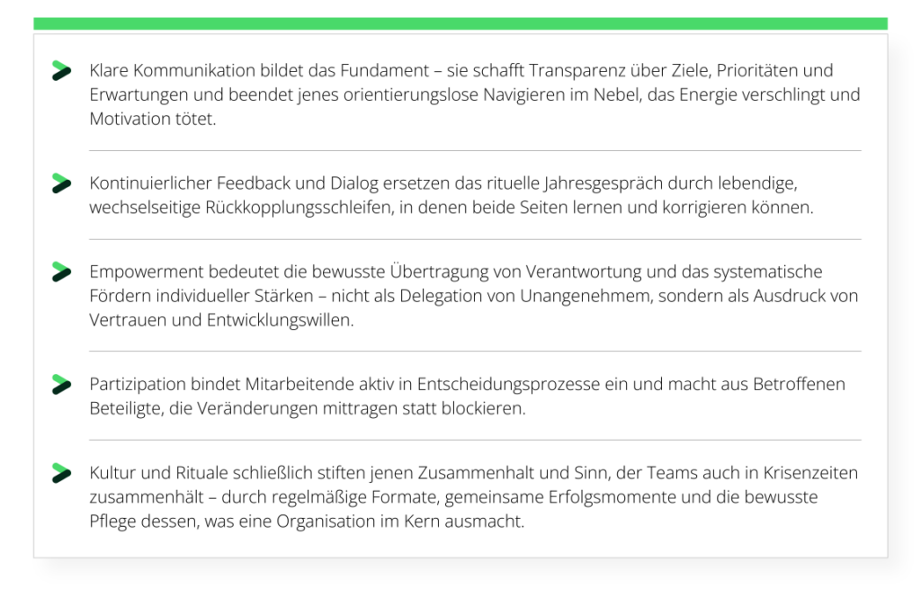 Durch klare Führungsrollen, messbare Führungsziele, konsequentes Vorleben im Top-Management und strukturelle Unterstützung im Führungsalltag.