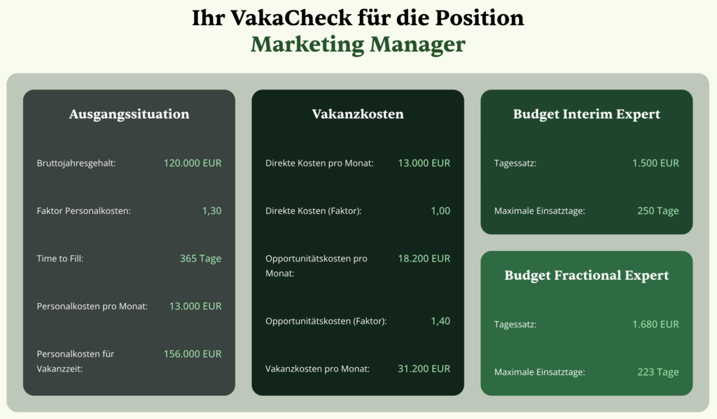 Begleitend wurde der VakaCheck® eingesetzt, um die wirtschaftliche Dimension der vakanten Position transparent zu machen. Auf Basis eines fiktiven Marketing-Manager-Gehalts von 120.000 EUR wurde ein monatliches Vakanzkostenrisiko von rund 31.200 EUR ermittelt. Diese datenbasierte Betrachtung schuf eine klare Entscheidungsgrundlage für das Fractional-Modell und minimierte das Risiko von Projektverzögerungen und Folgekosten. Das Modell Fractional Marketing Director Europa verbindet strategische Führung, operative Umsetzung im Digital Marketing und wirtschaftliche Transparenz bei gleichzeitig hoher Flexibilität.