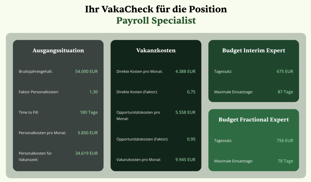 Die Kombination aus datenbasierter Vakanzkostenanalyse und branchenspezifischem Know-how machte den Unterschied. Mithilfe unseres bewährten VakaCheck® konnte exakt die passende Vakanzlösung mit einem Fractional Expert identifiziert werden – mit sofortiger Einsatzfähigkeit und tiefem Verständnis für die Besonderheiten der Baulohnabrechnung.