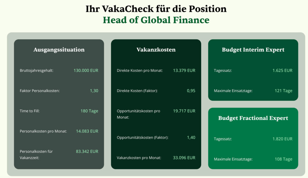 Zur wirtschaftlichen Bewertung und Absicherung der Entscheidung kam der VakaCheck® zum Einsatz. Der vereinbarte Stundensatz lag bei 180 EUR (1.440 EUR pro Tag bei einem Achtstunden-Tag). Durch die flexible Ausgestaltung konnte der Einsatz auf insgesamt 130 Tage bzw. 32 Wochen bei vier Einsatztagen pro Woche ausgeweitet werden.