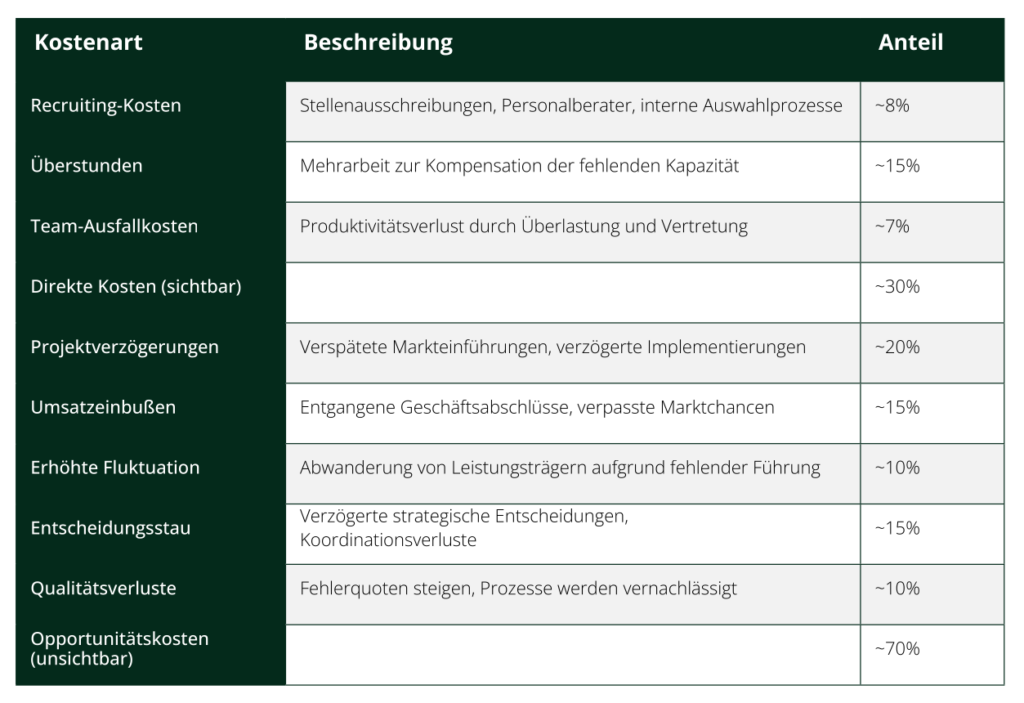 Die Gesamtkosten einer Vakanz setzen sich aus sichtbaren direkten Kosten und unsichtbaren Opportunitätskosten zusammen. Die direkten Kosten machen dabei nur etwa 30% aus, während die schwer messbaren Opportunitätskosten rund 70% der Gesamtkosten ausmachen.