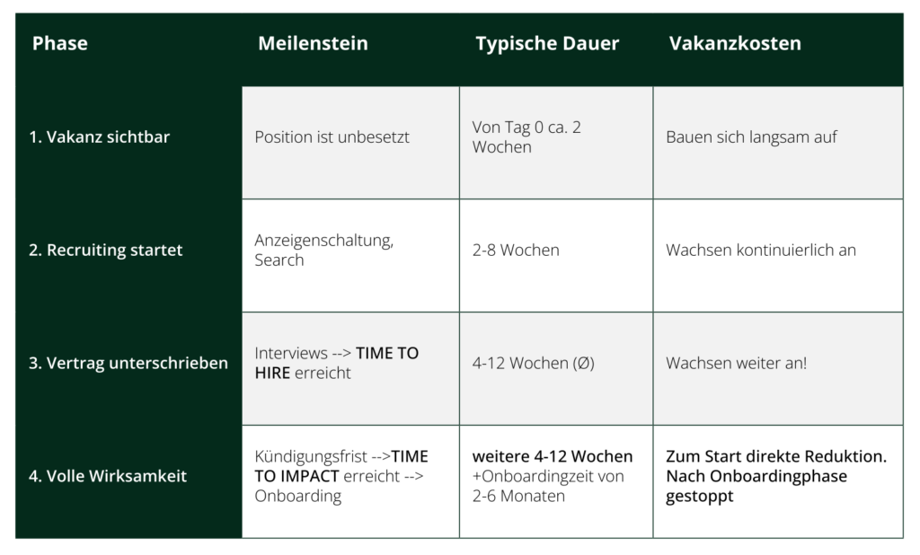 Die unsichtbare Phase: Zwischen Vertragsunterschrift und erster Wirksamkeit vergehen durchschnittlich weitere 4-12 Wochen (Kündigungsfrist) In der Phase des Onboardings samt Einarbeitung und Netzwerkaufbaus können weitere 2-6 Monate vergehen. In beiden Phasen fallen weiterhin Vakanzkosten an, da die Rolle noch nicht ihre volle Wirkung entfaltet. Die vollständige wirtschaftliche Bewertung einer Vakanz muss daher beide Phasen – Besetzung und Wirksamkeit – berücksichtigen.
