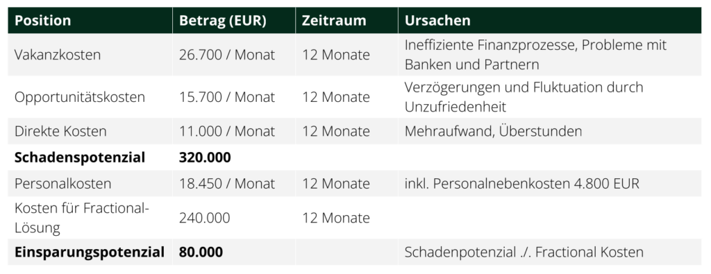 Als Ergebnis nach 12 Monaten bleibt festzuhalten, dass das Unternehmen sowohl neue Strukturen und Prozesse im Finanzmanagement einführen als auch ein neues Finanzierungskonzept mit der Bank umsetzen konnte. Zudem wurde ein neuer Finance Manager (geringeres Jahresgehalt) mit Start nach 12 Monaten gewonnen, und der Fractional Director übernimmt für die kommenden Monate mit dem freigewordenen Personalkostenbudget noch eine Mentorrolle in der Einarbeitungsphase. Festzuhalten bleibt: Das Budget des potenziellen Schadenspotenzials konnte somit effizient eingesetzt werden.