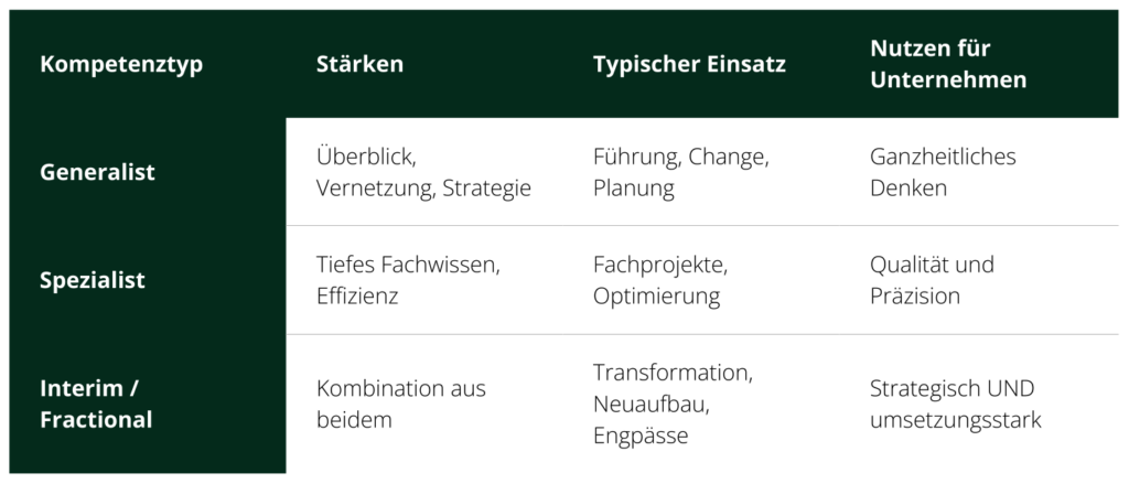 Fractional- und Interim-Professionals verkörpern genau diese Verbindung: Sie vereinen den Weitblick des Generalisten mit der Tiefenkompetenz des Spezialisten. Unternehmen erhalten damit das Beste aus beiden Welten – strategische Breite im Kernteam, operative Tiefe durch flexible Expertise. So entsteht ein hybrides Kompetenzmodell, das perfekt in die heutige Wirtschaft passt: Generalistische Steuerung mit punktueller Spezialisierung, flexibel skalierbar, ohne dauerhafte Fixkosten. Organisationen werden so beweglicher, Entscheidungsprozesse schneller und Strukturen schlanker.