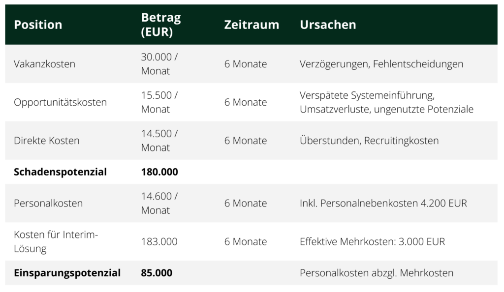 Ein mittelständisches Produktionsunternehmen (580 Mitarbeitende) verliert kurzfristig seine Kaufmännische Leitung (Jahresgehalt: 125.000 EUR) mitten in der Einführung eines neuen ERP-Systems. Klassisches Recruiting für die Position dauert bis zur Einstellung mindestens sechs Monate. Für die offene Position entstehen Vakanzkosten von ca. 30.000 EUR pro Monat.