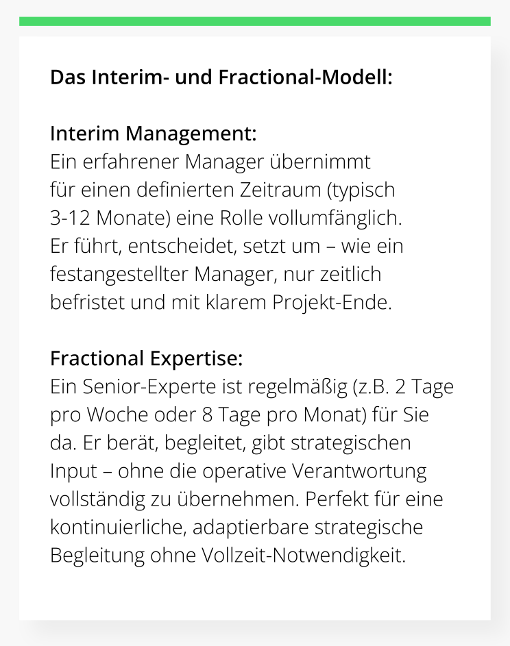 Interim bedeutet meist Vollzeiteinsatz auf Zeit, während Fractional-Modelle eine langfristige Teilzeitlösung für strategische Funktionen darstellen.